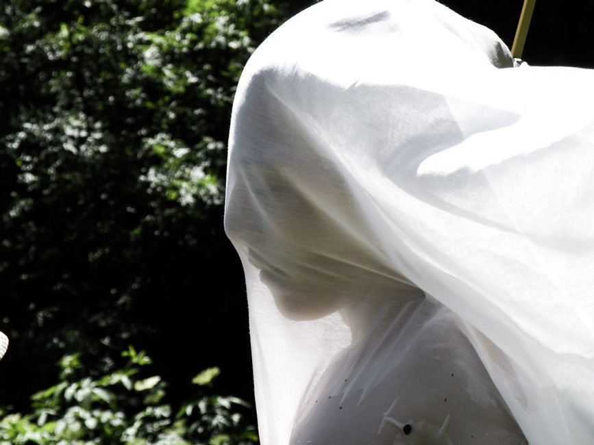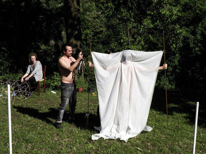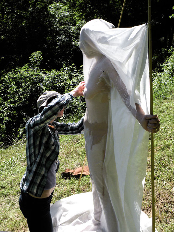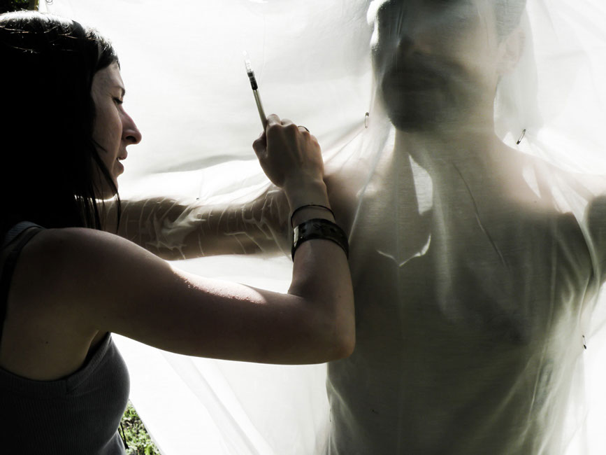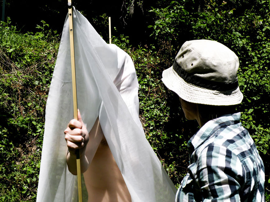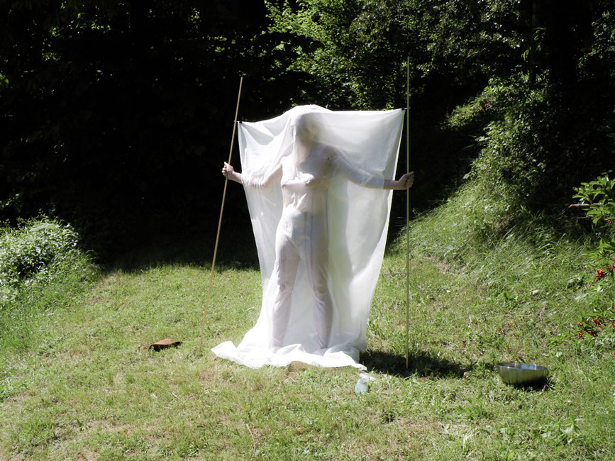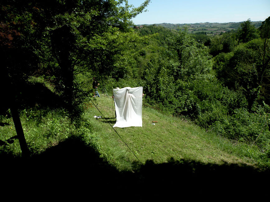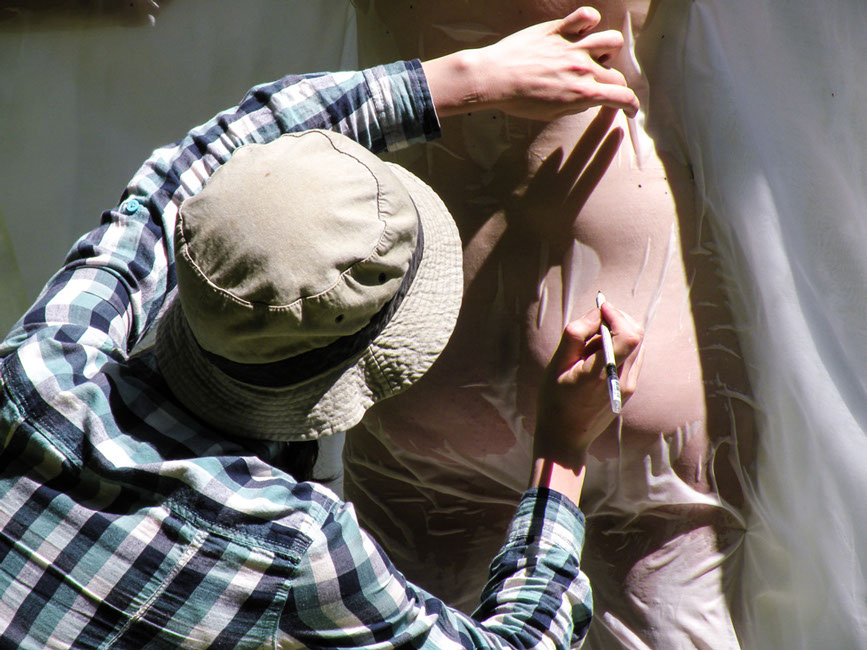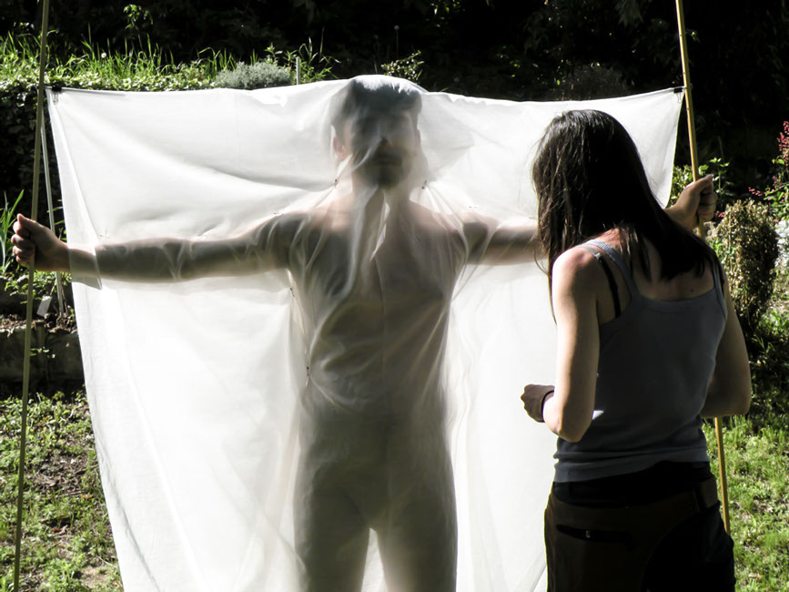 In ogni luogo scelto, ha messo in atto un azione di ricalco dei nei, attraverso l'uso di una tela di cotone fine, adagiata sul corpo nudo di ogni artista.